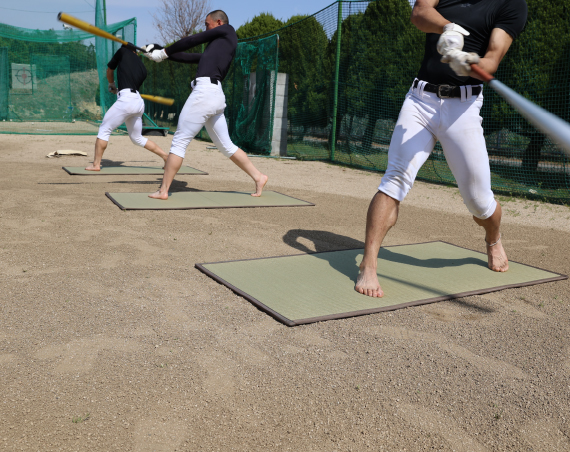 かつてのプロ野球の名選手が畳の上で素振りをして